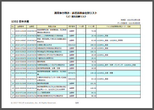 特許競争力「YK値」上位企業(約300社)について、YK値の高い特許をリスト化。直近に出願した特許リストも合わせて収録。