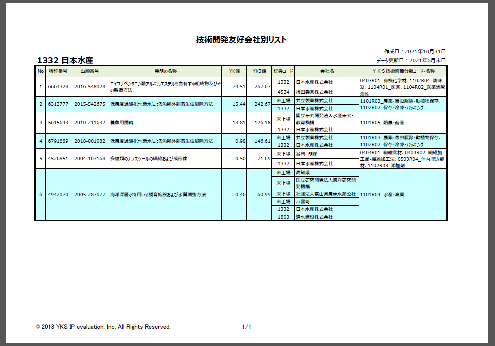 特許競争力「YK値」上位企業(約300社)について、共有特許をリスト化。最大でYK値が高い50特許まで収録。