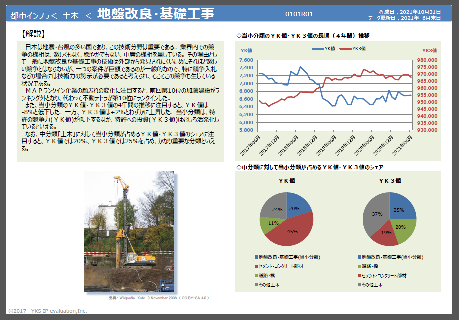 YKS技術業種分類(約300分類)ごとに、企業の特許競争力や技術面での競合関係、協力関係をマップとして表現。P2には特許競争力の長期トレンド(折れ線グラフ)や分布(円グラフ)も収録。