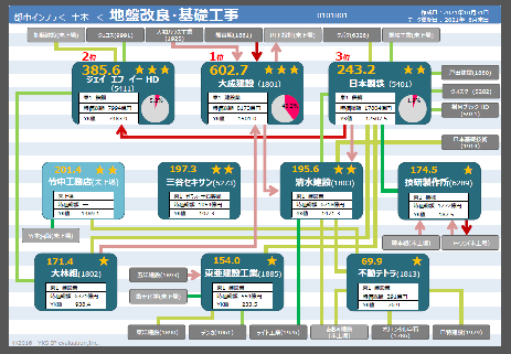 YKS技術業種分類(約300分類)ごとに、企業の特許競争力や技術面での競合関係、協力関係をマップとして表現。P2には特許競争力の長期トレンド(折れ線グラフ)や分布(円グラフ)も収録。